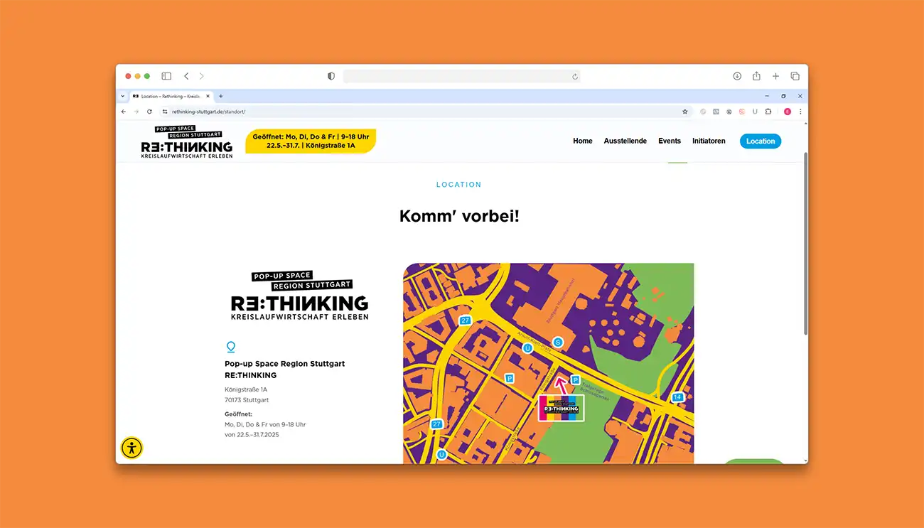 Neben der strategischen und gestalterischen Entwicklung waren wir auch für die räumliche Umsetzung verantwortlich: den RE:THINKING Pop-up Space Stuttgart in der Königsstraße 1A. Hier entstand auf rund 400 Quadratmetern ein inspirierender Erlebnisraum mit einem farblich abgestimmten, nachhaltigen Design. Dort präsentierten über 30 beteiligte Unternehmen innovative Ansätze für eine zukunftsfähige Wirtschaft und nachhaltige Markenentwicklung.